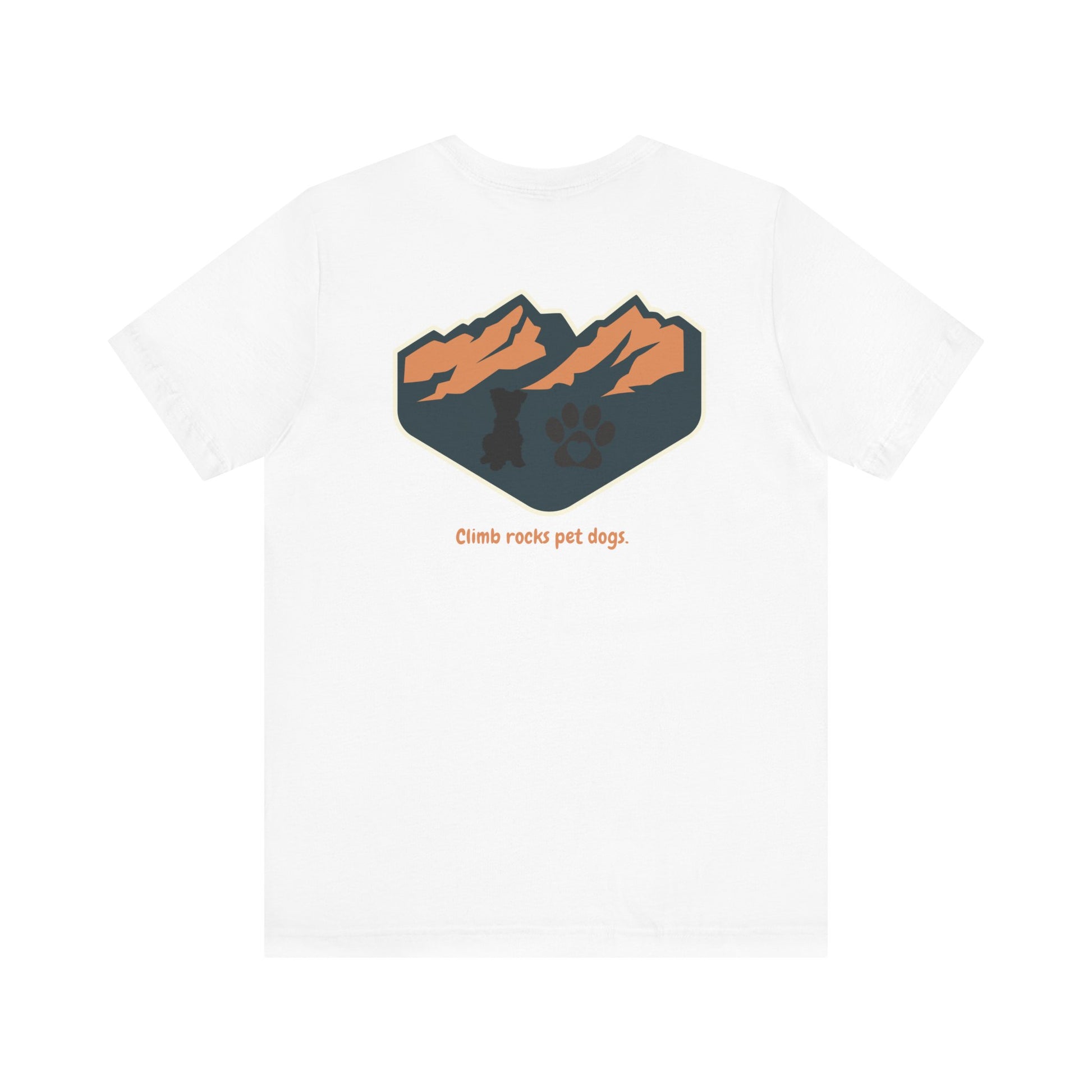 Embrace your adventurous spirit and showcase your love for dogs with the "Climb Rocks, Pet Dogs" Unisex T-Shirt—a perfect addition to any outdoor enthusiast's collection.